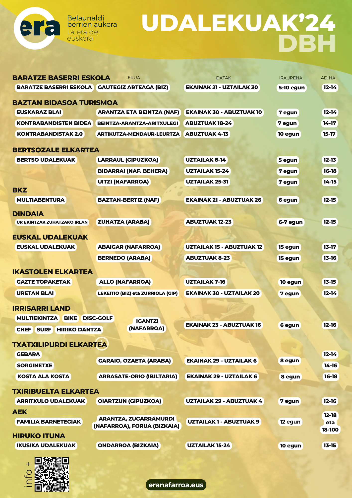 Nafarroako euskara zerbitzuek, ERA.EUS webgunean, euskarazko udaleku eskaintza ezberdinen bilduma egin dute, urtero bezala, familiek informazioa eta izen ematea ahalik eta errazen bilatu ahal izan dezaten. Euskal Herriko toki ezberdinetan antolatzen diren udalekuen artean hautatu ahal izanen dute, eta mota aunitzetako udalekuen artean. Aukera zabala dago! Hona hemen LHko nahiz DBHko haur-gaztetxoentzako udaleku aukeraren laburpen bilduma: